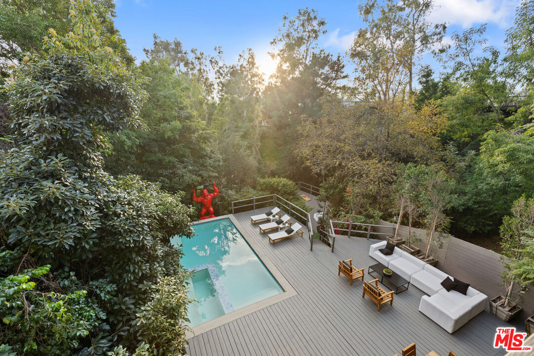 Welcome to a gated, sports-court estate tucked deep within Nichols Canyon, where mid-century lines meet a lifestyle centered around the outdoors. Once owned by a notable figure, the home is positioned for privacy and surrounded by mature greenery, with canyon views unfolding from multiple decks and terraces. The backyard is thoughtfully layered, with an expansive pool deck designed for both relaxation and entertaining. Lounge seating, dining space and shaded areas create a natural flow for gatherings throughout the day. Just beyond, a full sports court adds a dynamic element, ideal for pickup games, workouts, or hosting friends. The setting feels social yet secluded, offering a rare balance of energy and retreat. This is a home where indoor-outdoor living feels effortless and hosting becomes second nature.