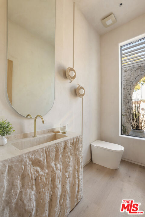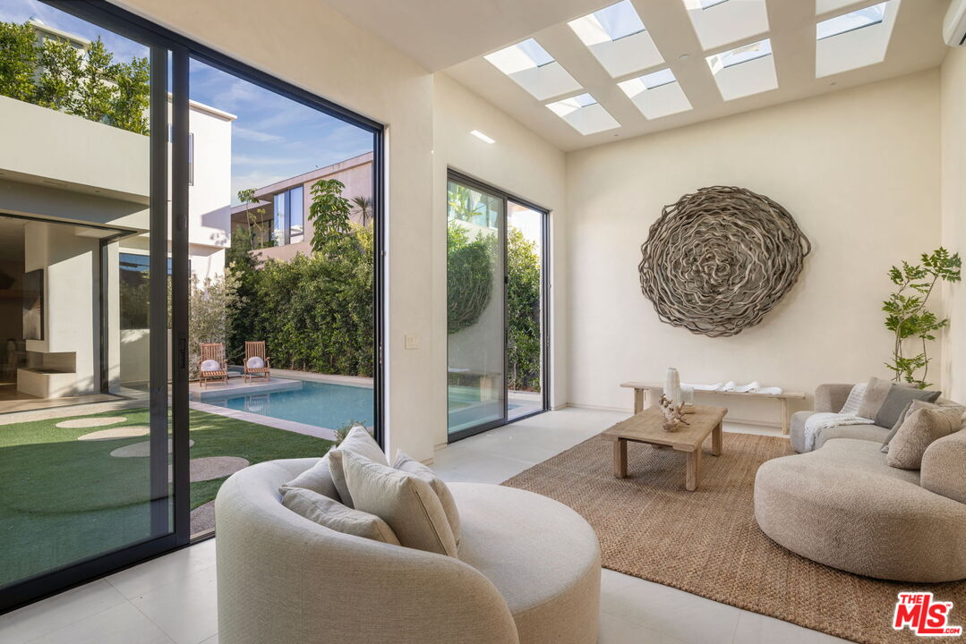 Located in one of LA's most sought-after enclaves, this Mediterranean-inspired residence exemplifies modern craftsmanship and elevated living. Upon entry, asculptural spiral staircasegracefully wraps around a mature olive tree, rising beneath a dramatic skylight that fills the foyer with natural light and sets a striking architectural tone. Inside, travertine finishes, plastered walls and contemporary curves create a seamless flow of texture and form throughout. Expansive, wall-to-ceiling sliding glass doors dissolve the boundary between the living spaces and the manicured backyard, flooding the interiors with natural light and enhancing effortless indoor-outdoor living. The chef's kitchen anchors the home with refined materials and meticulous detailing, ideal for both everyday living and hosting. Outside, the backyard unfolds as a private resort-style retreat, featuring a pool and spa, built-in BBQ and lush landscaping designed for year-round enjoyment, while a detached ADU provides flexibility for guests, work or extended living. Upstairs, the primary suite serves as a serene sanctuary with two expansive walk-in closets and a spa-like bathroom complete with a soaking tub. Two additional bedrooms occupy the second level, offering comfort, privacy and thoughtful separation. Complete with a two-car garage and exceptional attention to detail throughout, this smart home delivers a rare blend of architecture, function and lifestyle, quietly positioned near boutique shopping and acclaimed fine dining in one of Los Angeles' most coveted neighborhoods.